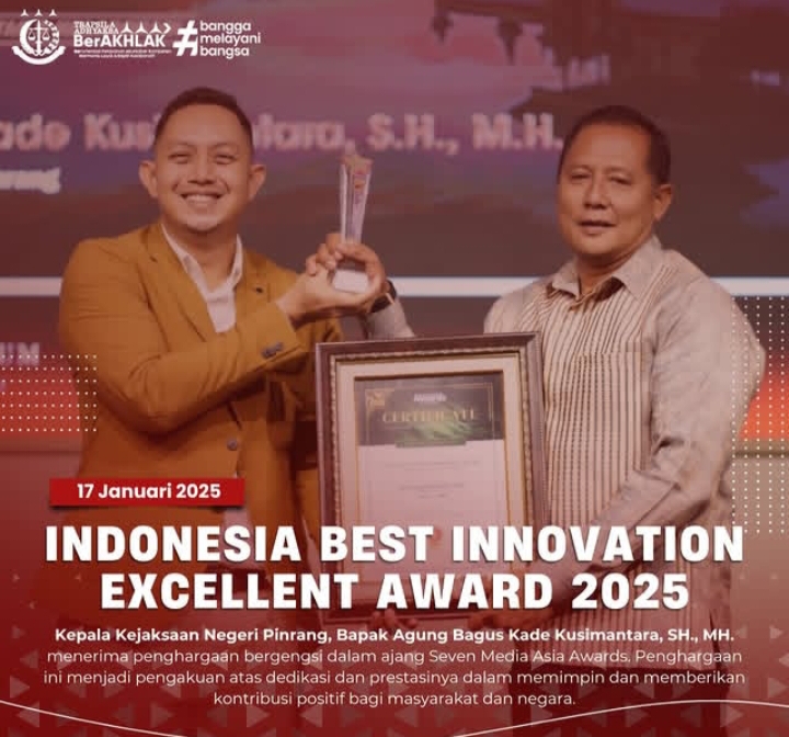 CAKRAWALAINFO.CO.ID, PINRANG – Kepala Kejaksaan Negeri Pinrang, Agung Bagus Kade Kusimantara, SH, MH, kembali mengukir prestasi dengan menerima penghargaan bergengsi dalam ajang Seven Media Asia Awards.