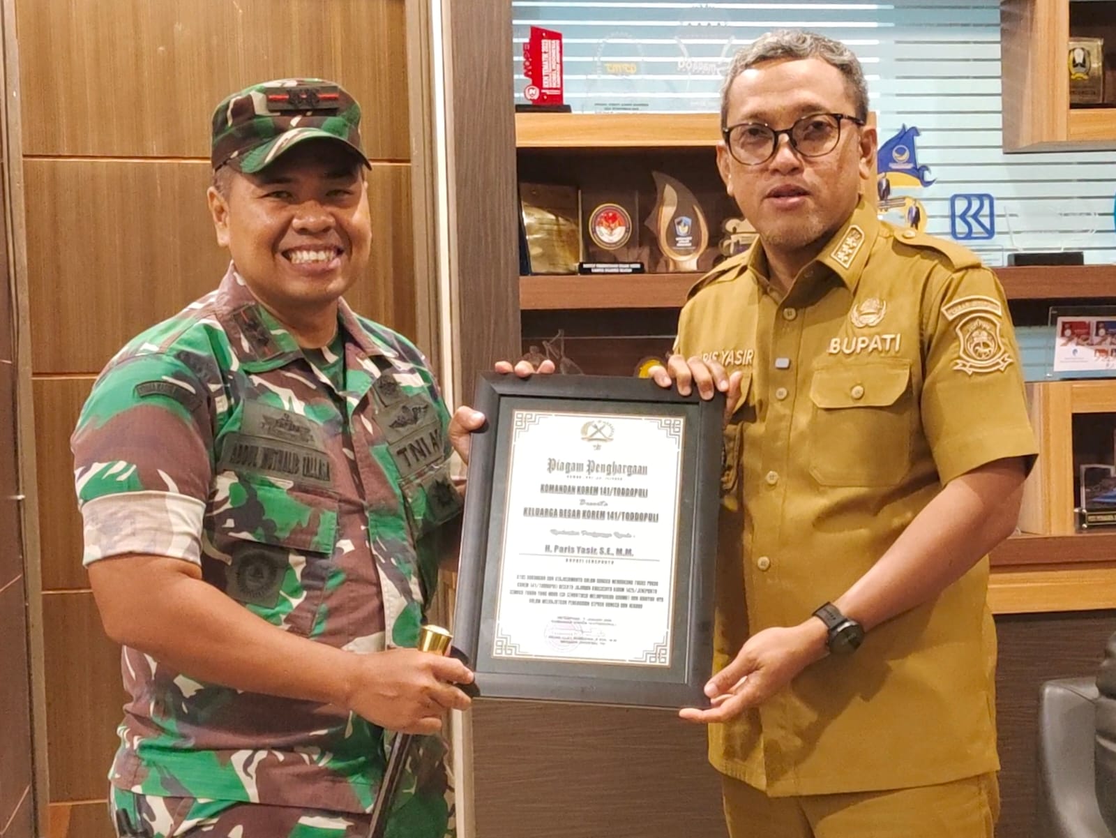 Dandim 1425/Jeneponto, Serahkan Piagam Penghargaan Danrem 141/Toddopuli kepada Bupati Jeneponto