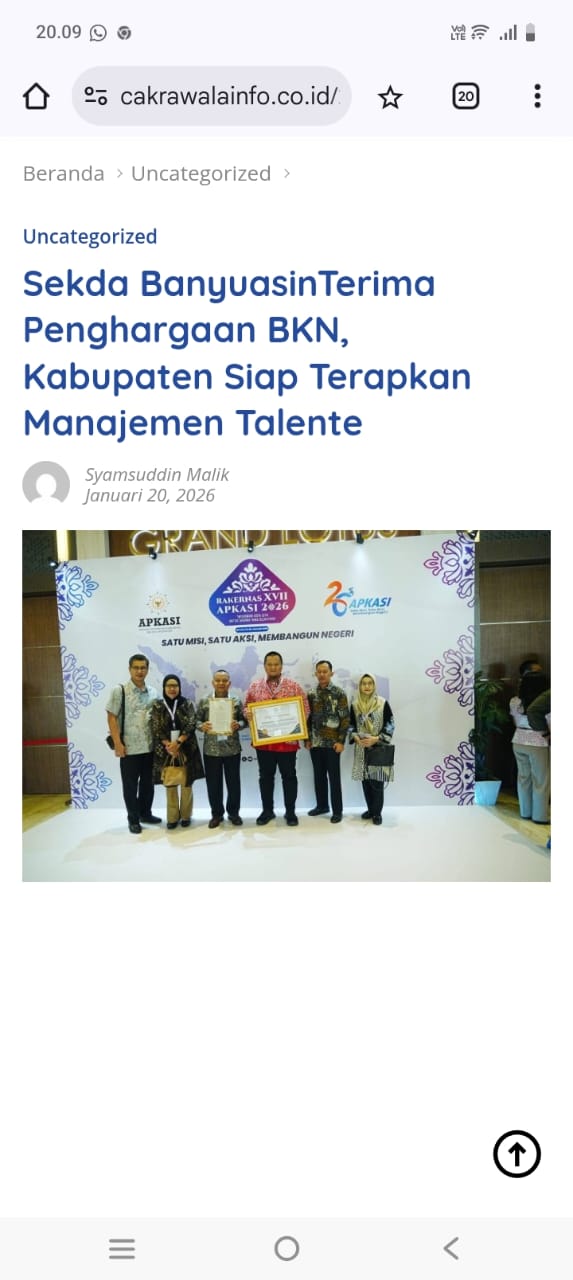 CAKRAWALAINFO.,CO.ID, BANYUASIN — Bupati Banyuasin Dr. H. Askolani, SH., MH diwakili Sekda Banyuasin Ir. Erwin Ibrahim, ST., Mm MBA IPU ASEAN Eng menerima penghargaan atas keberhasilannya memperoleh persetujuan penerapan manajemen talenta instansi daerah di wilayah kerja kantor regional VII Badan Kepegawaian Negara sebagai dasar pengembangan talenta dan karier ASN yang dilaksanakan melalui mobilitas talenta dalam Rapat Kerja Nasional (Rakernas) XVII Asosiasi Pemerintah Kabupaten Seluruh Indonesia (APKASI) yang digelar di Aston Hotel Grand Lotus, Batam, Kepulauan Riau, Selasa (20/1/2026).