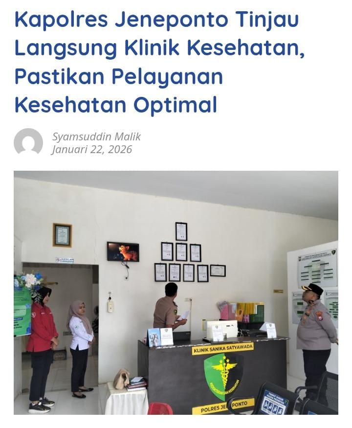 CAKRAWALAINFO.CO.ID, JENEPONTO – Memasuki hari-hari awal setelah serah terima jabatan, Kapolres Jeneponto yang baru, AKBP Haryo Basuki, S.I.K., M.H., langsung memulai langkah nyata dengan melakukan pengecekan dan pembenahan internal. Salah satu fokus kunjungannya adalah ruang Klinik Kesehatan Sanika Satyawada Polres Jeneponto, Kamis (22/1/2026) pagi.