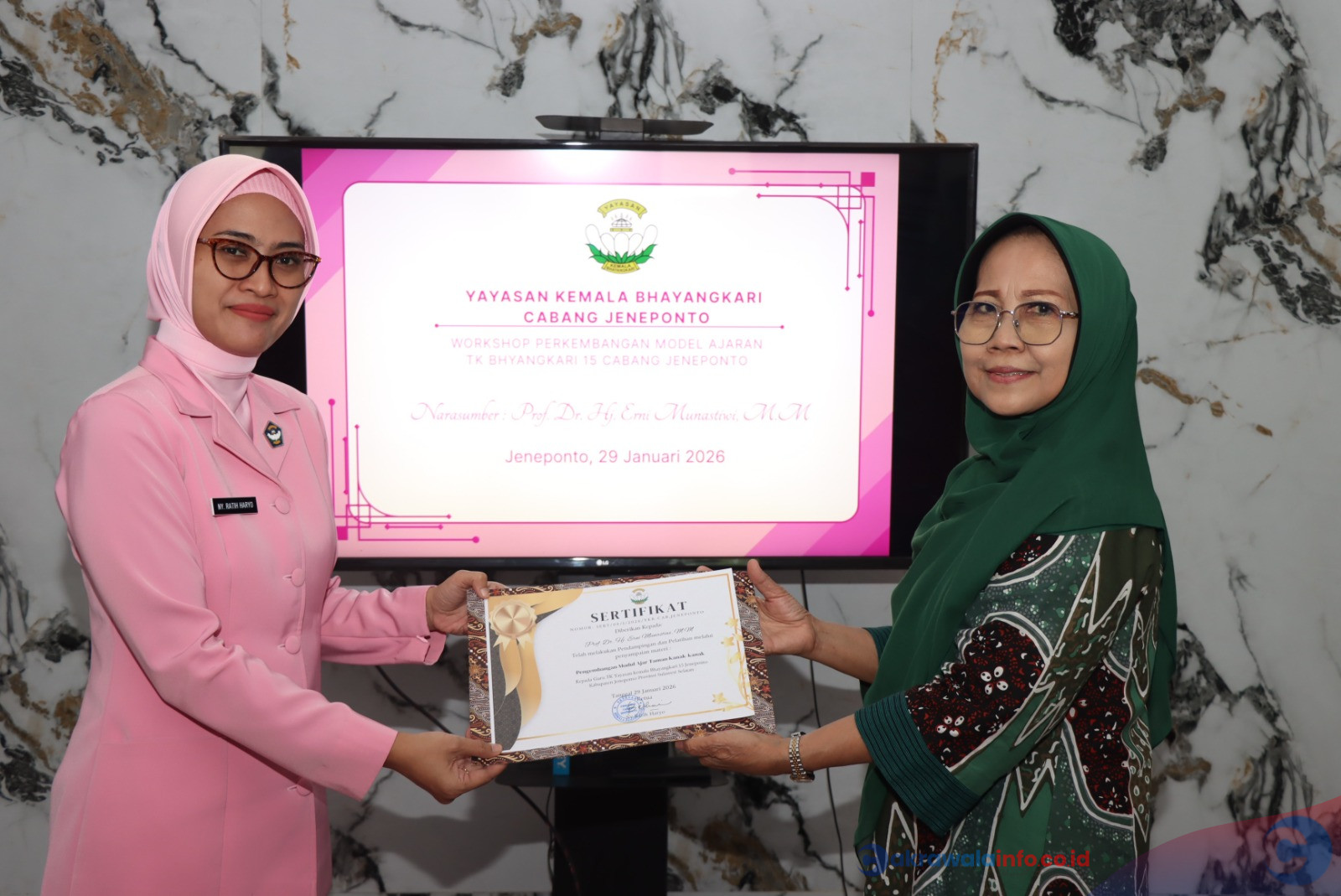CAKRAWALAINFO.CO.ID, JENEPONTO – Dalam rangka meningkatkan mutu pendidikan anak usia dini, Yayasan Kemala Bhayangkari Cabang Jeneponto menyelenggarakan Workshop Pembelajaran dengan tema “Pengembangan Modul Ajar Taman Kanak-Kanak”. Kegiatan yang berlangsung pada Kamis (29/1/2026) ini dihadiri langsung oleh Ketua Yayasan, Ny. Ratih Haryo, yang bertempat di Ruang Vidcon Lantai 1 Polres Jeneponto.