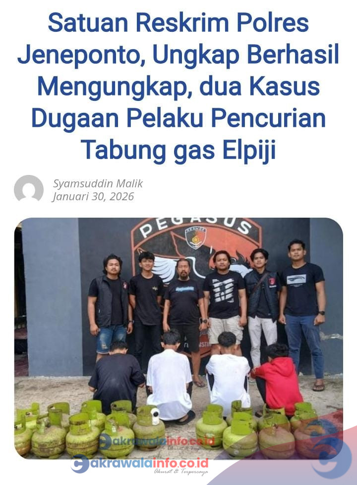 CAKRAWALAINFO.CO.ID JENEPONTO -– Kepolisian Resor (Polres) Jeneponto, di bawah pimpinan Kapolres AKBP Haryo Basuki, S.I.K., M.H., berhasil mengungkap dua kasus pencurian tabung gas elpiji 3 kilogram dan menangkap empat terduga pelakunya. Operasi penangkapan dilakukan Tim Pegasus Resmob Satuan Reserse Kriminal (Sat Reskrim) pada Kamis (29/1/2026) di Jalan Tembakau, Kelurahan Bontosunggu Timur, Kecamatan Binamu.