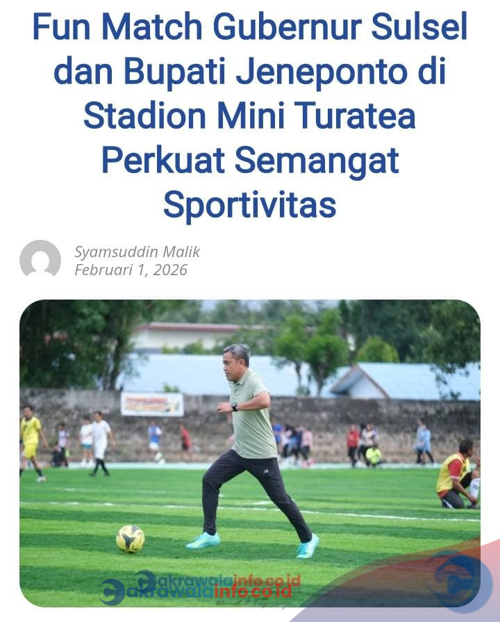 CAKRAWALAINFO. CO. ID, JENEPONTO — Pemerintah Kabupaten Jeneponto menyambut kehadiran Gubernur Sulawesi Selatan, Andi Sudirman Sulaiman, dalam kegiatan fun match yang digelar di Stadion Mini Turatea. Kegiatan olahraga persahabatan ini berlangsung meriah dan menjadi sarana mempererat kebersamaan antara pemerintah dan masyarakat, jeneponto Sulawesi Selatan. (1/2/2026.