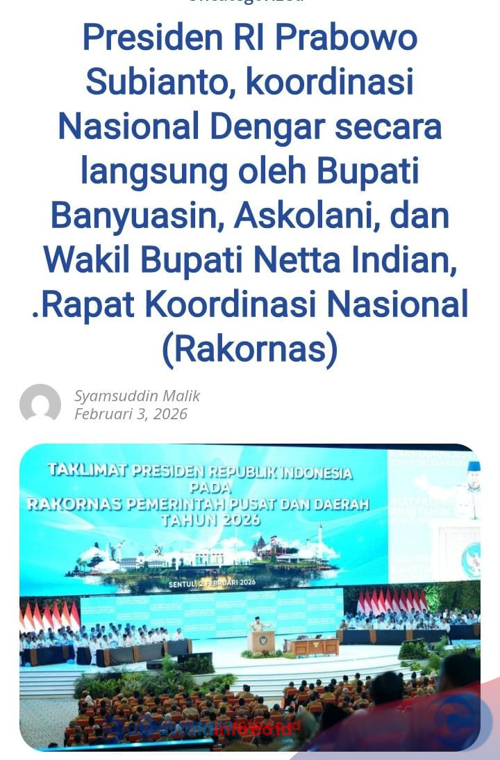 CAKRAWALAINFO.CO.ID, BANYUASIN — Arahan strategis Presiden RI Prabowo Subianto kepada jajaran pemerintahan daerah sebagai bagian dari koordinasi nasional didengar secara langsung oleh Bupati Banyuasin, Dr. H. Askolani, S.H., M.H dan Wakil Bupati Banyuasin, Netta Indian, SP. Rapat Koordinasi Nasional (Rakornas) Pemerintah Pusat dan Daerah Tahun 2026 digelar di Sentul International Convention Center (SICC), Bogor, Jawa Barat, Senin, (2/2/2026).