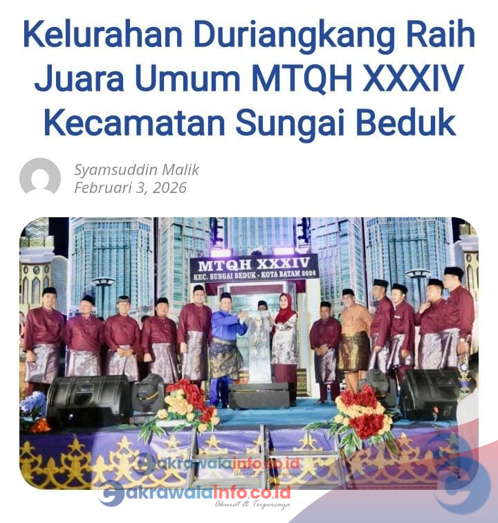 CAKRAWALAINFO.CO.ID, BATAM –– Kelurahan Duriangkang berhasil keluar sebagai juara umum pada Musabaqah Tilawatil Al-Qur’an dan Hadis (MTQH) XXXIV tingkat Kecamatan Sungai Beduk Tahun 2026. Capaian tersebut diumumkan dalam acara penutupan yang secara resmi dilakukan Sekretaris Daerah Kota Batam, Firmansyah, mewakili Wali Kota Batam, Amsakar Achmad, dan Wakil Wali Kota Batam, Li Claudia Chandra, Senin (2/2/2026) malam.