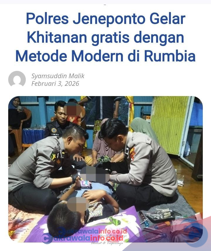 CAKRAWALAINFO. CO.ID, JENEPONTO – Sejumlah anak dari keluarga kurang mampu di Kecamatan Rumbia, Kabupaten Jeneponto, mendapatkan pelayanan khitanan (sunat) gratis dengan metode modern yang cepat. Kegiatan bakti sosial yang digelar pada Senin, 2 Februari 2026 ini, merupakan inisiatif dari Kasi Dokkes Polres Jeneponto beserta personelnya.