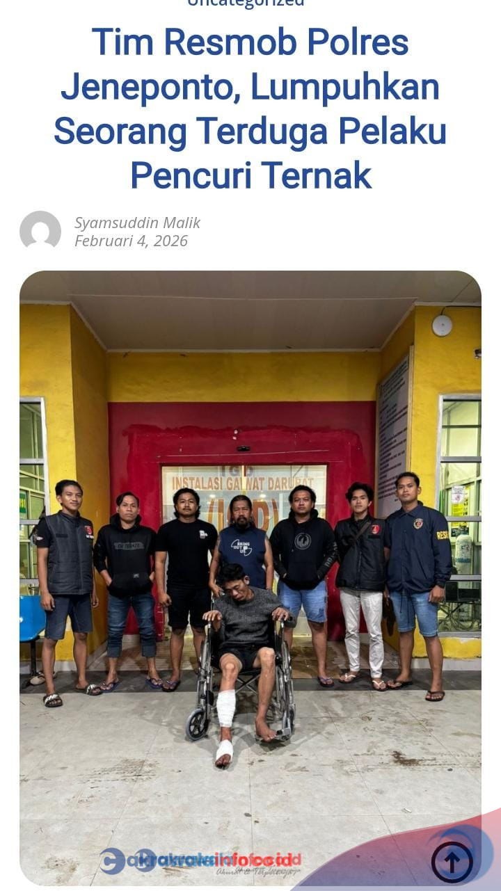 CAKRAWALAINFO.CO.ID, JENEPONTO – Tim Pegasus Resmob Polres Jeneponto melumpuhkan seorang terduga pelaku pencurian ternak saat upaya penangkapan di Dusun Taipa Tinggia, Desa Gunung Silanu, Kecamatan Bangkala, Kabupaten Jeneponto, Sulawesi Selatan, Selasa sore, 3 Februari 2026.