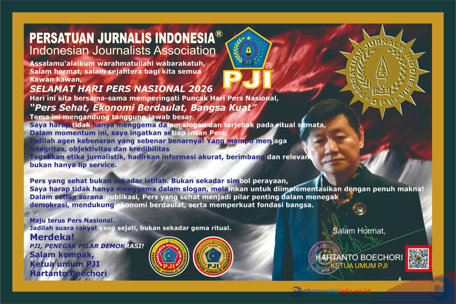 CAKRAWALAINFO. CO. ID, SURABAYA — Hartanto Boechori Ketua umum ( PJI) Persatuan Jurnalistik Indonesia, Mengucapkan selamat Hari Hari Pers Nasional, (8/2/2026).
