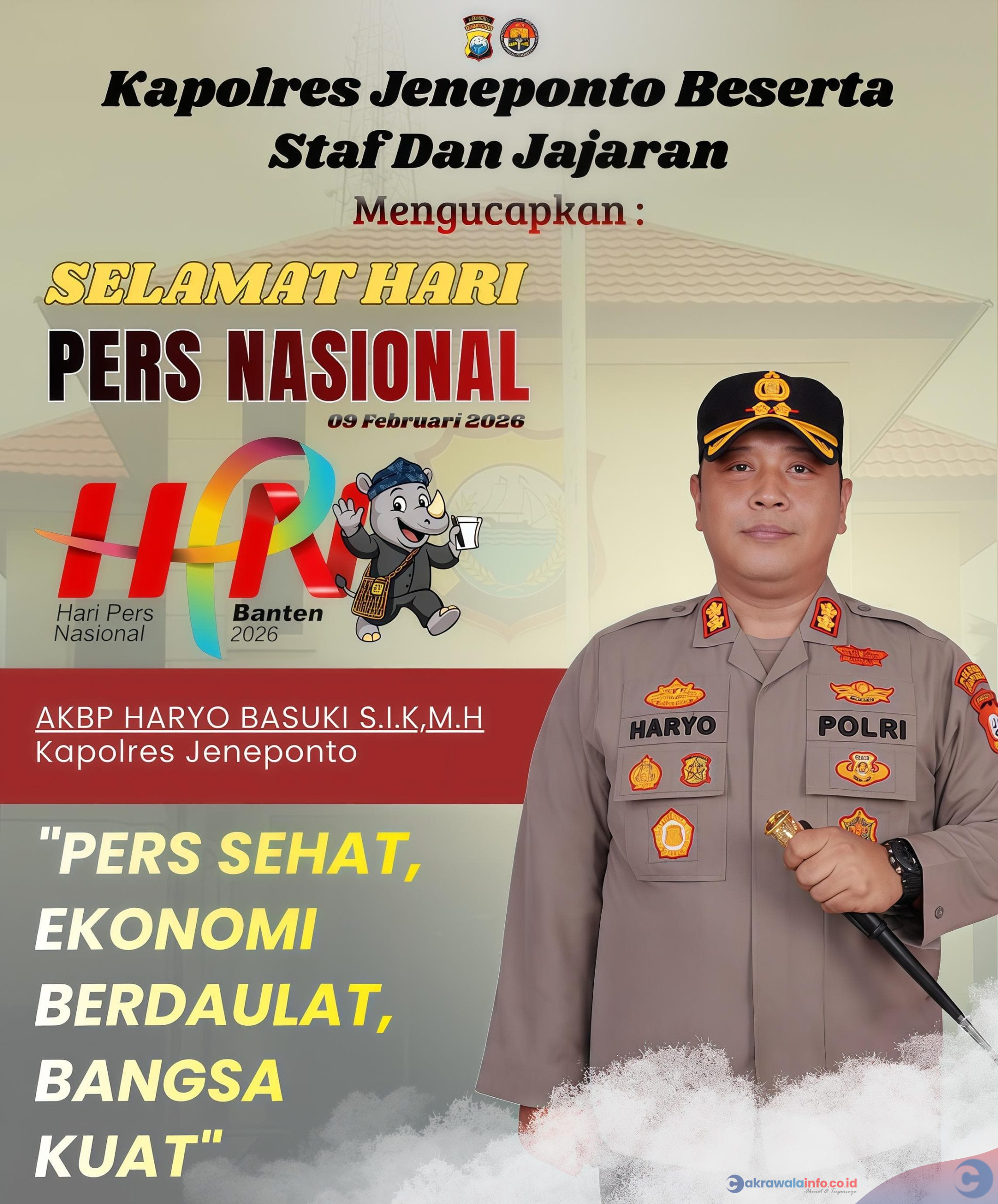 CAKRAWLAINFO.CO.ID, JENEPONTO – Kapolres Jeneponto, AKBP Haryo Basuki, S.I.K, MH, turut memeriahkan peringatan Hari Pers Nasional (HPN) 2026 dengan menyampaikan ucapan selamat melalui beberapa platform media sosial, Jeneponto, 9 Februari 2026.