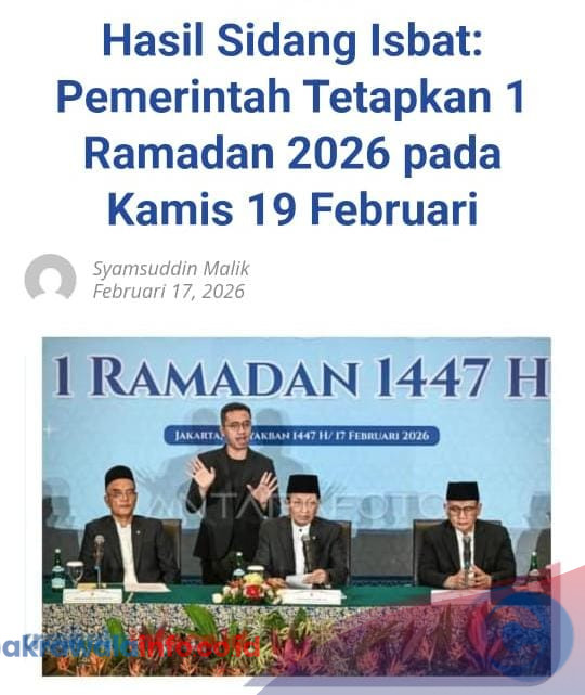 “Disepakati bahwa 1 Ramadan 1447 Hijriah jatuh pada hari Kamis, 19 Februari 2026,” kata Menteri Agama (Menag) Nasaruddin Umar dalam konferensi persnya yang dipantau dari Cakrawalainfo.co.id.