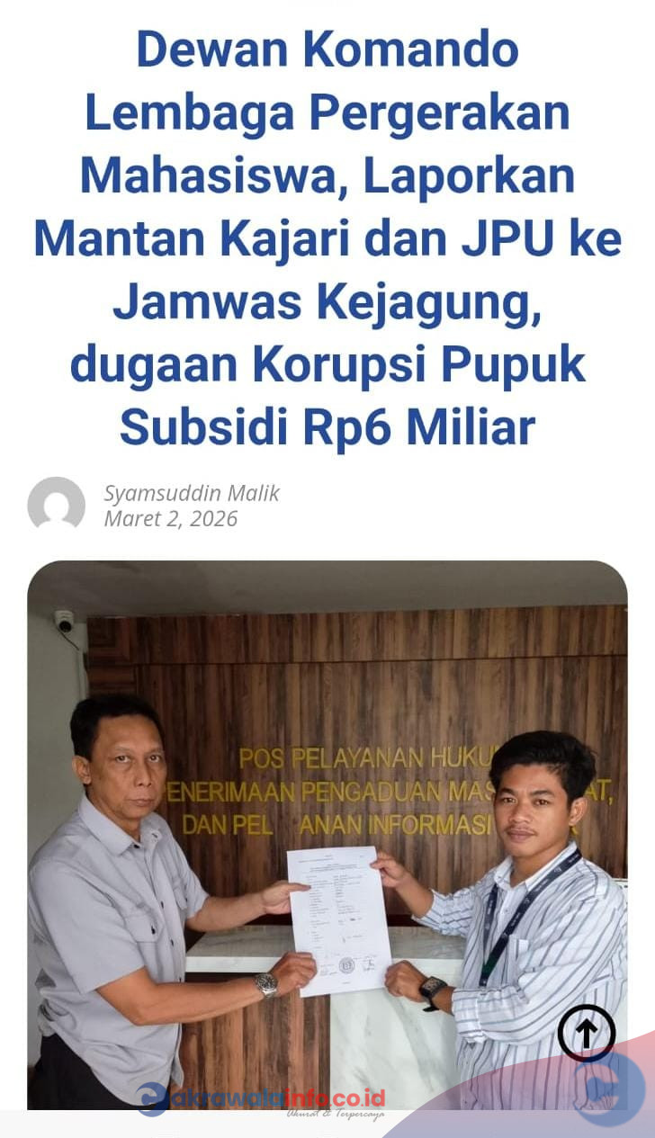 CAKRAWALAINFO.CO.ID, JAKARTA – Dewan Komando Lembaga Pergerakan Mahasiswa, Agung Setiawan, resmi melaporkan dua mantan Kepala Kejaksaan Negeri (Kajari) dan seorang jaksa penuntut umum (JPU) atas dugaan pelanggaran kode etik dalam penanganan perkara korupsi pupuk subsidi senilai Rp6 miliar di Kabupaten Jeneponto, Sulawesi Selatan(2/3/2026).