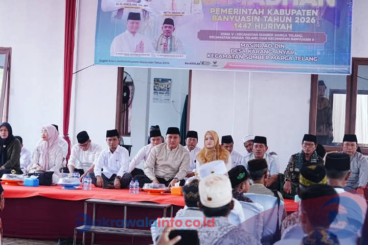 CAKRAWALAINFO.CO.ID, BANYUASIN. — Safari Ramadhan Pemerintah Kabupaten Banyuasin 1447 Hijriah tahun 2026, Zona V Kecamatan Sumber Marga Telang, Kecamatan Muara Telang dan Kecamatan Banyuasin II digelar di Masjid Ad-Din Desa Karang Anyar dibuka langsung oleh Wakil Bupati Banyuasin, Netta Indian, SP digelar Kecamatan Sumber Marga Telang, Kamis (5/3/2026).