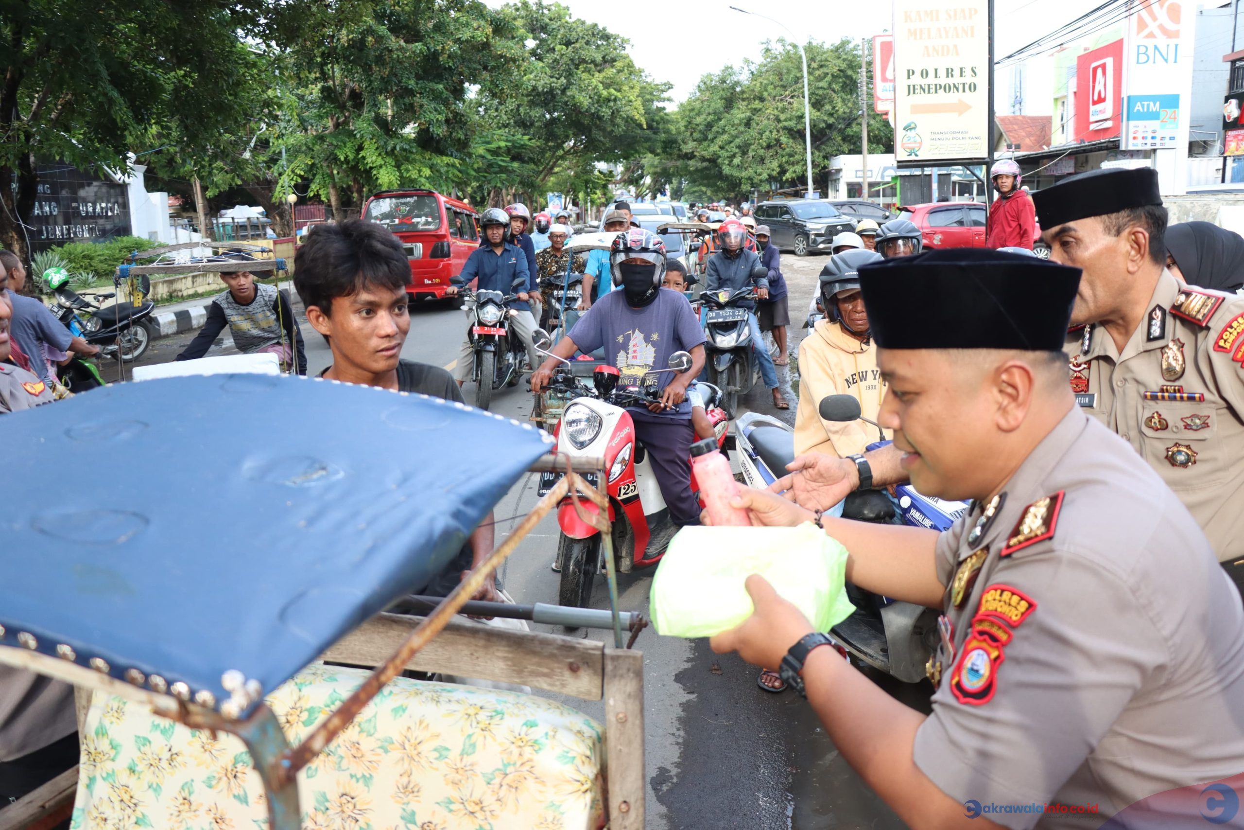 CAKRAWALAINFO.CO.ID, JENEPONTO – Dalam rangka menyemarakkan bulan suci Ramadhan 1447 H serta mempererat tali silaturahmi dengan masyarakat, Kapolres Jeneponto AKBP Haryo Basuki, S.I.K., M.H., bersama Ketua Bhayangkari Cabang Jeneponto Ny. Ratih Haryo, membagikan takjil buka puasa kepada masyarakat pengguna jalan dan warga sekitar, pada Senin sore, kabupaten Jeneponto Sulawesi Selatan (10/3/2026).