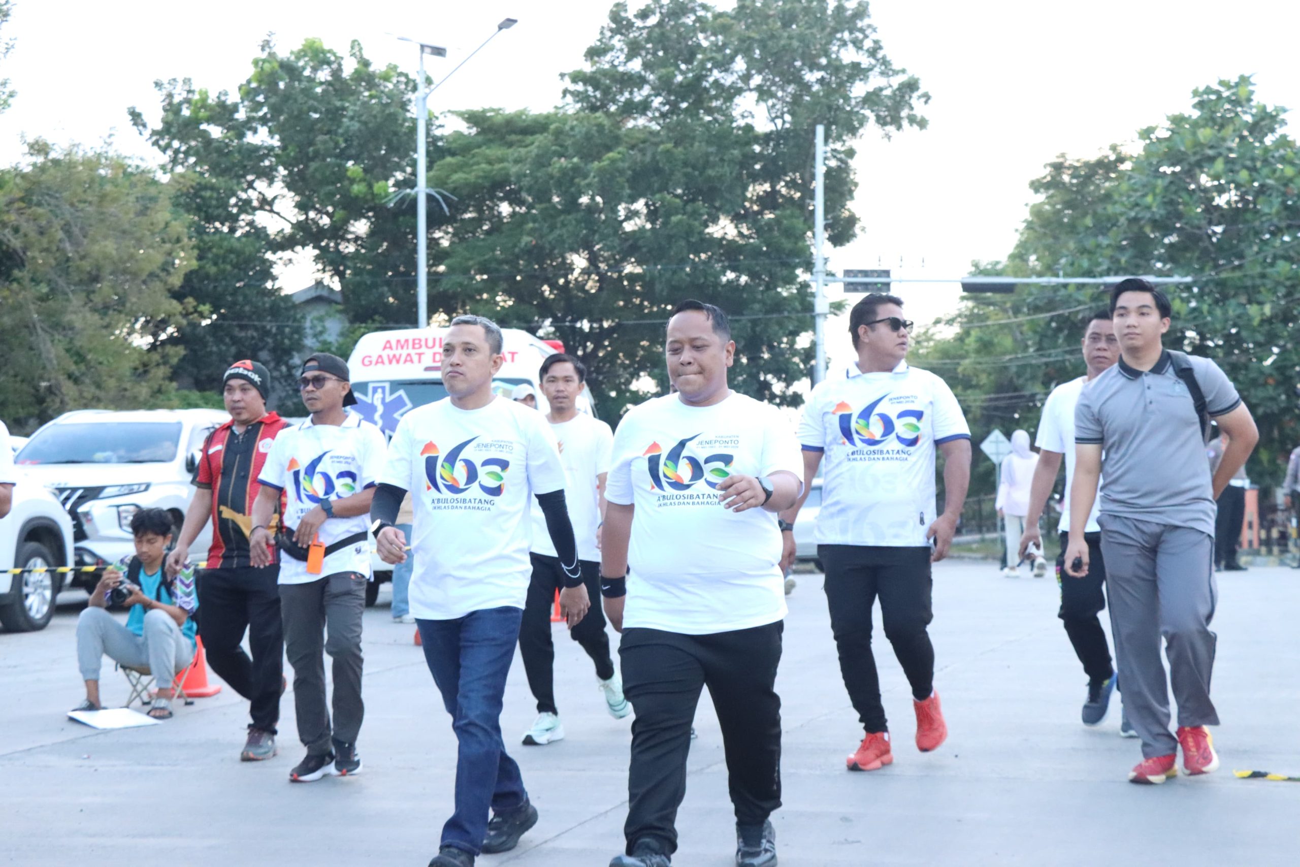 Kegiatan yang berlangsung meriah ini dihadiri langsung oleh Bupati Jeneponto H. Paris Yasir serta unsur Forkopimda lainnya. Kehadiran tokoh-tokoh daerah dan aparat keamanan dalam satu barisan berjalan santai menunjukkan kekompakan dan sinergi yang baik antara pemerintah, kepolisian, dan masyarakat.