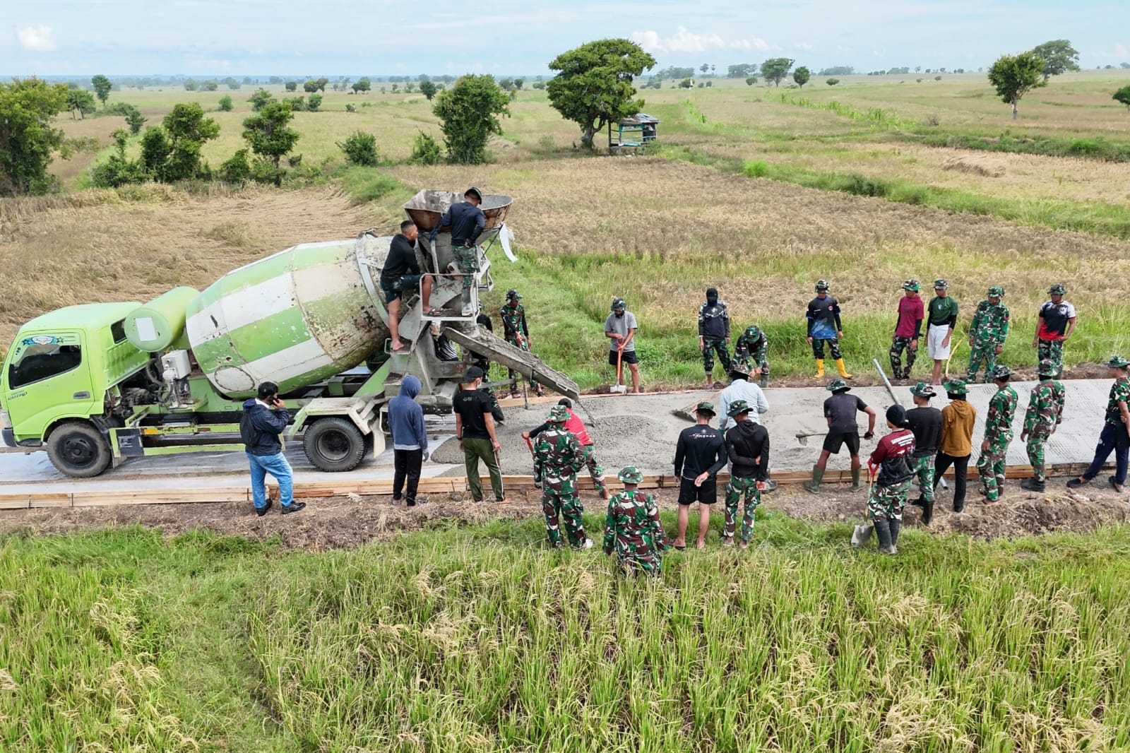Personel Satgas TMMD yang terdiri dari TNI, Polri bersama masyarakat turun langsung ke lokasi, mengaduk material, meratakan permukaan, hingga memastikan setiap jengkal jalan tercor dengan rapi.